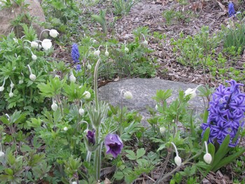 hydrangea, pasque flower, grape hyacinth, and some mystery whites, all getting along famously