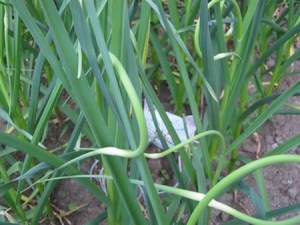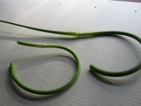 You snap them off, then trim the long chivey ends, leaving the pale green tip and about six inches of stem. Toss them in olive oil, salt and pepper; wrap in tin foil and leave on the grill for fifteen minutes or so. (Bonus: removing the scapes means fatter garlic bulbs.)