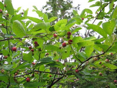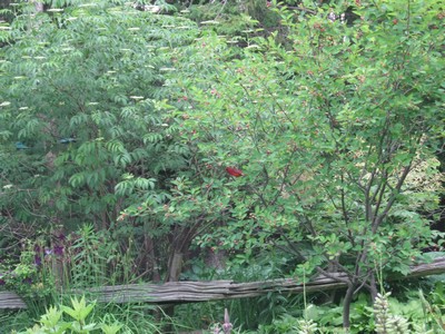 The gardening robin is in the serviceberry tree. The fruit’s just ripening and he’s all over it these days, flapping amongst the leaves, hopping nervously from branch to branch. He used to be more relaxed about things but I guess he’s twigged that I’m also fond of the stuff.
