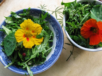 This one includes nettles, dandelion leaves, mesclun, arugula, lambs’ quarters and purslane. Oh, and nasturtium leaves and flowers for oomph and a peppery je ne sais quoi-ish quality that never hurts and is not hard on the eyes.