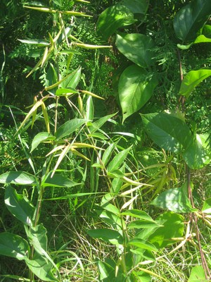 About this time of year the green pods are turning brown and dry, inside which are milkweed-like fluffs with seeds attached; hard to tell them from the milkweed ‘santa clauses’ when they’re flying about. The bounders.