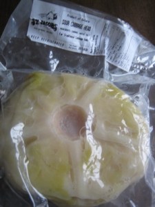 A pickled head of (sour) cabbage. Product of Ontario. This alone makes me happy, being as how there’s little at this time of year that’s from this part of the world. Still, I’ve never seen anything like it and have no idea what to do with it. I assume it’s a version of sauerkraut, which I happen to love but have only ever seen in a jar—I’m thinking I could cut it up and use it the same way. I don’t see a price but how much can it be? It’s cabbage.