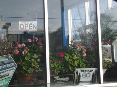 Geraniums blooming in the window of a gas station that’s been owned by two brothers for twenty-five years. The kind of place where they pump your gas and chat about the weather and tell you there’s been a gas station on that site since the 1920’s; they clean your windshield and check your oil and have hydraulic lifts and tools and if you drive in with a flat, they can fix it.