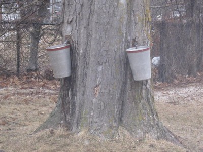 Four silver pails hanging on the trunk of a front yard maple. (I want a front yard maple!)