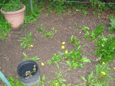 Et voila!  The shady corner of the garden where pissenlit (translation: ‘wets the bed’—dandelion is a known diuretic so maybe best not to eat bucketsful before lights out) shares space with the domestic variety, as well as horseradish, nettles and returning tufts of raddicho. The naked bits are where seeds have been sown for a fresh Fall crop. (Think salad… with chopped egg, garlic and a warm grainy mustard/bacon vinaigrette.)