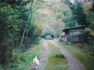 As we turn in, a white chicken jumps out of the shrubbery and runs alongside our car in a very excited sort of chicken waddling way, ushering us in the whole way to the house. We’re amazed and honoured. The Mr. of the B&B and a yellow lab greet us and we chat briefly and as I’m remarking on the beauty of the place, saying I’d love to stroll through the garden sometime, the Ms. of the B&B pops her head out the back door and hands me a bowl, and without a hello or a howdoyoudo, says no one goes in or out of the garden empty-handed and would I pick some nasturtium flowers for the evening salad. Oh, I love nasturtiums, I say; would she like leaves as well as flowers? She doesn’t answer immediately, looks quite disappointed in fact, and it occurs to me that she wasn’t prepared for my familiarity with flower eating, that it’s possible I’ve denied her the pleasure of shocking me. In any case, she’s not amused. This is the first sign that we’re not merely at an organic farm B&B as we’d hoped—to breathe clean air, eat fresh food and learn how to pick wild mushrooms—but at a B&B that prides itself on offering an ‘organic farm experience‘ to city folk who for the most part don’t the know the difference between parsley and chives.