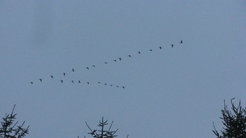 Ten thousand geese fly over my house at dusk, honking madly as I set out for a walk. And the moon (and is it Venus?) hangs over a fat white contrail in the not yet completely dark sky.
