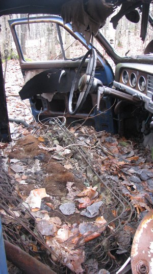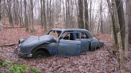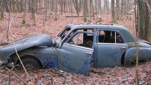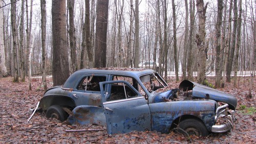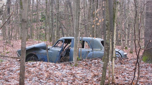 In 1961, a homeless wanderer wandered into what was just the beginnings of a forest and made this car his home for six months. He looked into the trunk only once, on a Saturday in October, for a blanket, not for clues. He found neither.