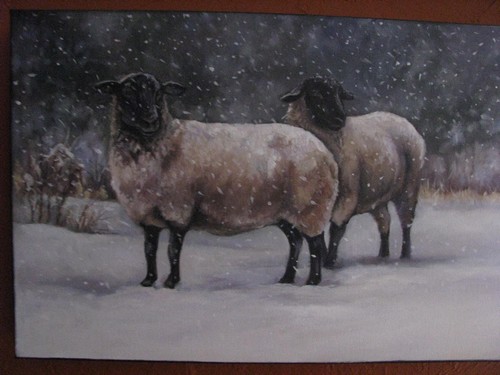 This morning I danced to Ladysmith Black Mambazo in front of a winter scene by Lynne Campbell, black-legged sheep in falling snow. I didn’t think much about winter or sheep, or Africa for that matter although I wondered if the music was inspired by the land. I would assume so, drums and heartbeat. And then I thought of a pueblo in New Mexico full of tourist buses and the woman I met as I walked across a parking lot who lived there and for some reason stopped to tell me that when the buses and the people were gone you could feel the energy of the red earth through your feet.