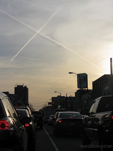 1. This is an ominous one, Carin. The darkness, and all those cars with unseeable drivers (waiting?), and the contrails forming that huge X like a portent. I like the way the white line on the road draws the eye along the rows of cars and then up, where it’s echoed in the X.