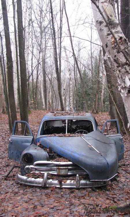 1. I know. The doors and the hood. Very crazy. And it’s right in the middle of a thickly wooded area. Am assuming it was once a field that grew up around it over decades. Would so love to know the story behind this. Making one up just won’t do it for me!