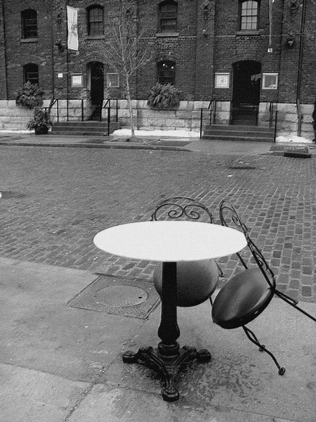 1. Yes, it’s Toronto, the Distillery District a couple of weeks ago. Black and white seems to lend itself more to ‘imagination’, doesn’t it… makes things look more exotic than the Kodachrome verison of where we live. (: