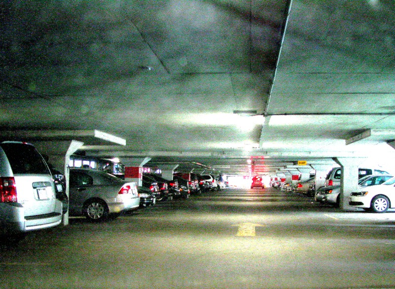 I like the pattern here of the parked cars with their repeated red rear lights (red echoed in that one car at leaving, and in the reflection in the ceiling), and the arrow seems to suggest they could go on forever. Interesting lighting. And the angle makes the ceiling seem very low and somehow heavy. You’ve captured this so as to make the garage feel surreal, even though it’s such an everyday space.
