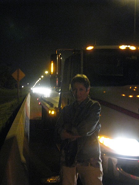 2. Very intriguing, but I can’t even begin to imagine the story behind it. Your truck? That pose — the stance and the arms crossed: you look either ticked or determined. A bit intimidating too! Where’s the driver? Or were you driving? I like the shadowiness of the shot, and the composition with the line of lights leading off to the horizon line, and the blur of headlights coming this way. When’s the reveal?