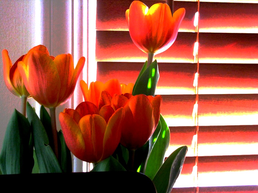 1. Mmmmm! Glowing colours, clever juxtaposition of shapes! I love the horizontal blinds against the rounded tulip shapes, and the brilliant purplish-whitish vertical element on the left. And … SPRING! LOVELY.