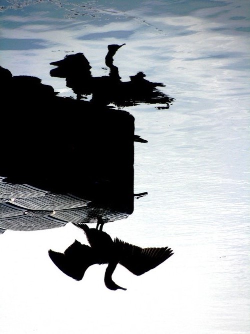 Oh tricky tricky Ms. Magtree! to generate a moment of confusion — HOW did she do that??? Followed of course by a rather abashed shah! oho! Very nice, very effective. I love how the watery sky world seems much realer than the “real” world, and the heron (or cormorant?) becomes a kind of Platonic reality of birds in general, bird spirit, shall we say! Lovely.
