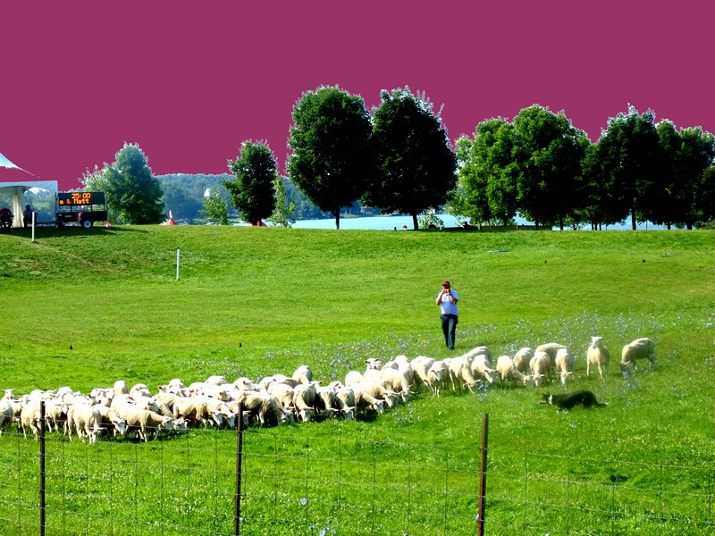 1. The she is a he and he’s the shepherd. (Plenty of she shepherds though.) And it’s his dog. Through different whistles, he tells the dog to take the sheep left or right or straight ahead, or to separate certain ones from the flock, etc. It’s quite something to watch. A two day event. I know. Hard to believe there’s an excitement factor, but there is. That and a picnic lunch!