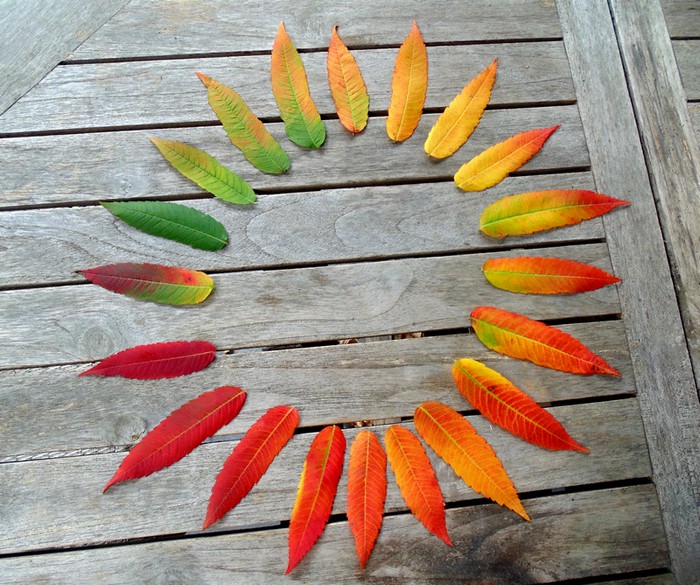 As others have commented, I enjoyed the thought of you carefully arranging this wheel of colour. Your question about whether the leaves have special significance in aboriginal culture made me want to look it up so I did and found out (from Wikipedia) that “Native Americans… use the leaves and drupes of the smooth and staghorn sumacs combined with tobacco in traditional smoking mixtures” and also make a sour drink with it, sometimes known as Indian lemonade. This made me wonder which Native Americans, which reminded me of a dinner party I was at last winter in Labrador where an Innu woman commented that she had never eaten squash before, was told by a non-Innu diner that squash came from aboriginal people, and responded vehemently “Not from our side!”