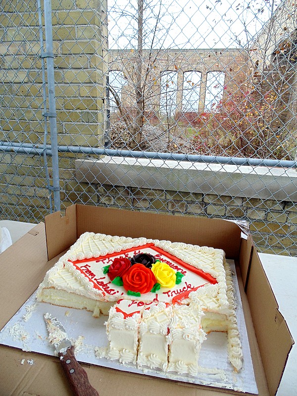 1. This is wonderful! And intriguing. What’s this about a “found” truck? Who’s “Lorie….” (couldn’t’ make out the whole name!) — and what a great contract: the yummy dug-into cake against the chilly outdoor wire-framed scene! Now tell us about the party!!!