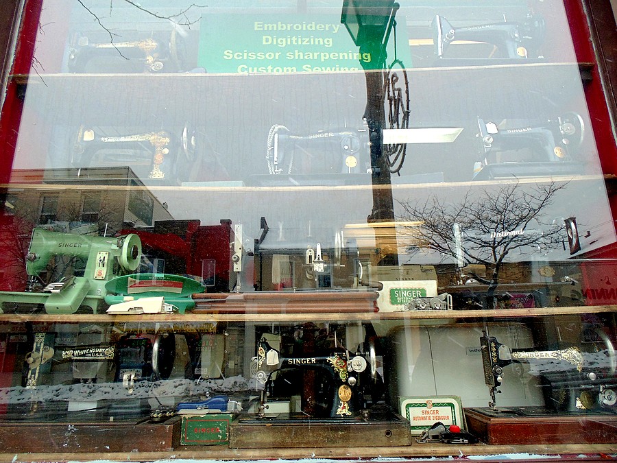 3. I had a Singer just like the one centre bottom of your picture! It was almost as hardy as my Mom’s old treadle machine, which I also kept until 10 years ago! So what memories this photo brought back, as well as showing us, as Elizabeth say, a whole intricate world in there. Plus they do knife scissor and “digitizing” and custom sewing … and they certainly have the machines for it! I think you should definitely venture in. And I love the glossy patina of the reflections, all those clever machines preserved “under glass”!
