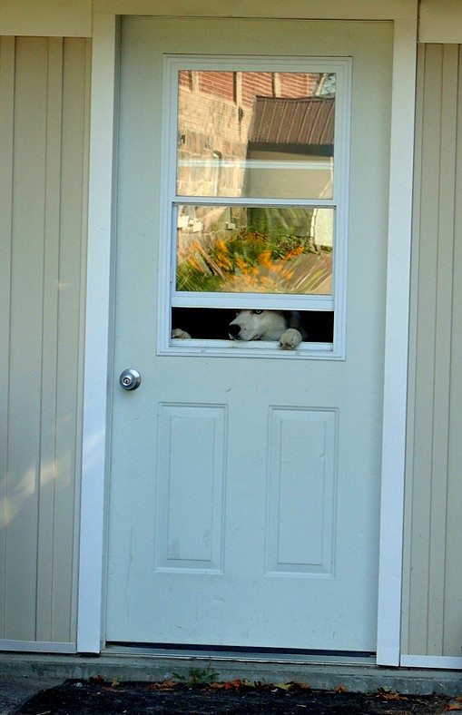 2. Perrrfect! The reflections, the lovely pearl blue door — and… (to quote the wonderful “Shakespeare in Love” — “And a DOG!”.