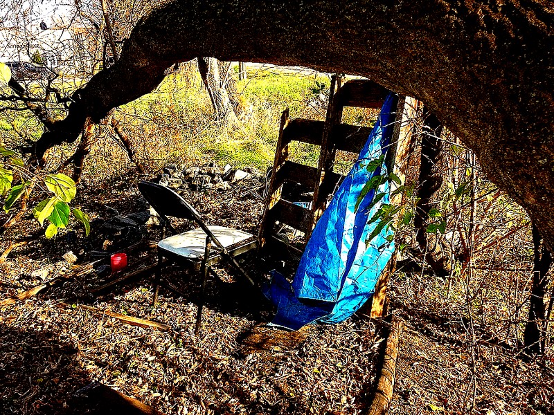 A blue tarp (?), a folding chair, the head-and-foot boards of an old bed … a red apple on a bough, ah wilderness were paradise enough!