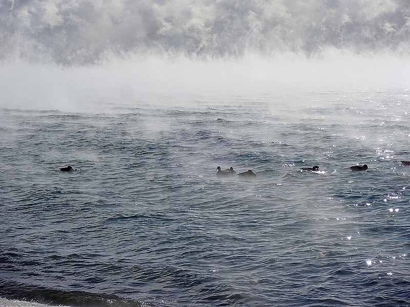 When temperatures drop suddenly, especially after being weirdly mild, this thing happens sometimes, over open water. I’ve only seen it once before, a couple years ago. I remember looking it up when I got home and learning that the term is steam devils.