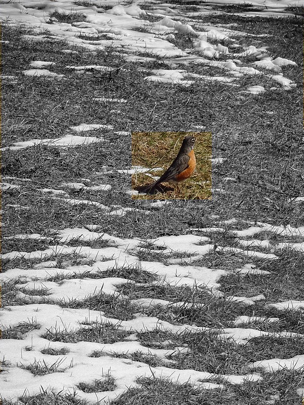 Spot the robin! Love it. This is a sweet photo with a hint of humour. Aren’t we all desperately searching for signs of robins and spring colour after the monochromatic winter? My eye is imagining that square growing slowly larger and larger, spreading colour as the snow around it melts. If I knew how to create a .gif, that would be a terrific spring one. :)