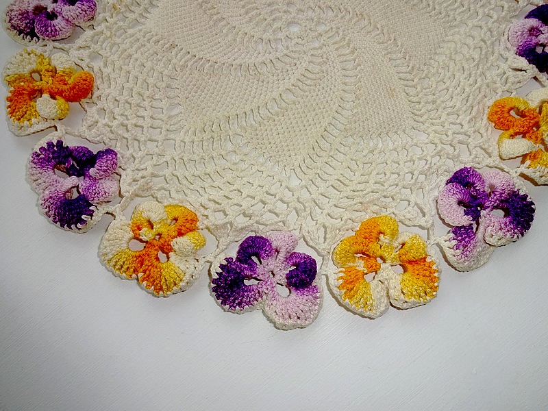 1. I can do very basic crotchet. Granny squares, that kind of thing. So I know how finicky the high-fallutin’ stuff would be. Making this would require skill indeed. Those flowers! Pansies… appropriate for the time of year, no? (: