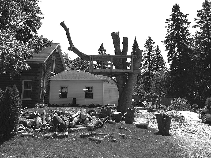 1. I’m pretty sure that tree is long dead and had to come down, noting that the other trees are in full leaf and flower but it isn’t, but presumably they thought the main trunk was still strong enough to support the treehouse. I love the two little birds perched on the “stumps” of branches. And that is such an Ontario house with its decorative brick edgings! Definitely a photo that tells a story.