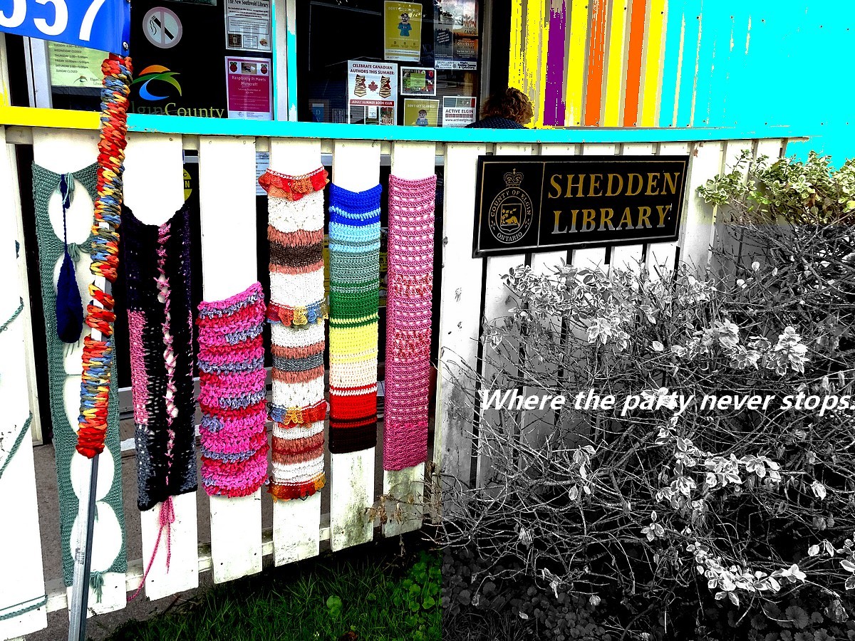 1. The only colour added is the turquoise and yellow up top. The fence is white and the knittery on it is in its true colours. Shedden is a small town in Essex County where I spent the weekend being amused and delighted by many things. It was so what I wasn’t expecting but turned out to be something even more wonderful in its realness and charm. Just before taking this photo a woman came out of the library to adjust a sign and I asked if it was open. At two o’clock, she said, and I asked what time it was now. “Five to two.” And with that she went back inside. Rules you know. I thought her rather cheerless attitude was in such contrast to the look of the place… I didn’t wait the extra five minutes.