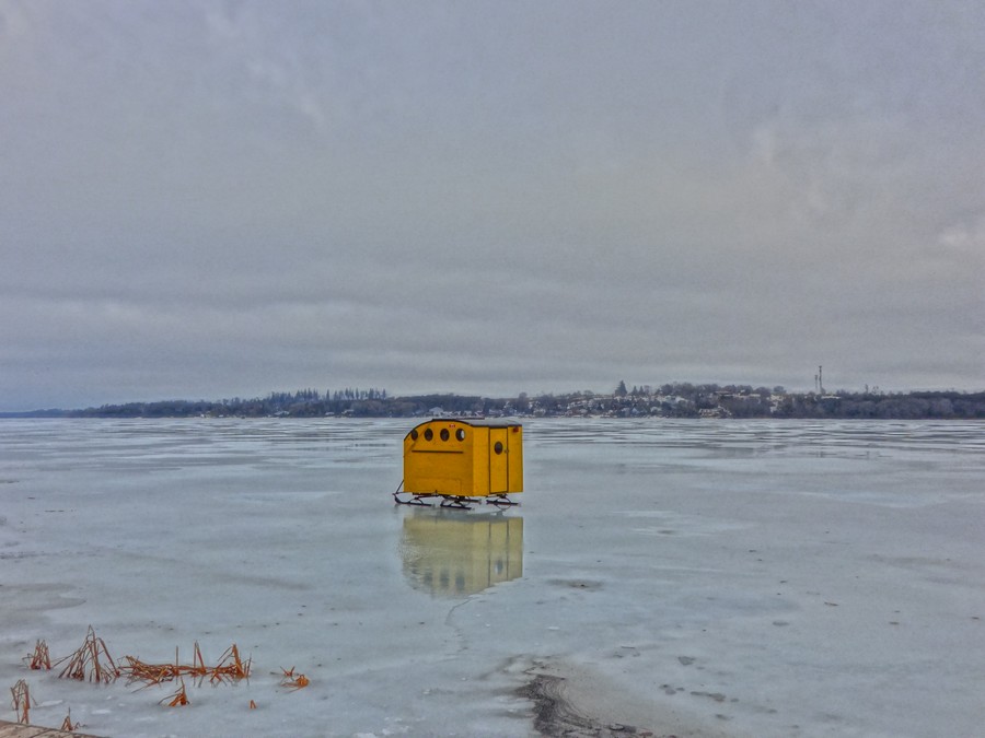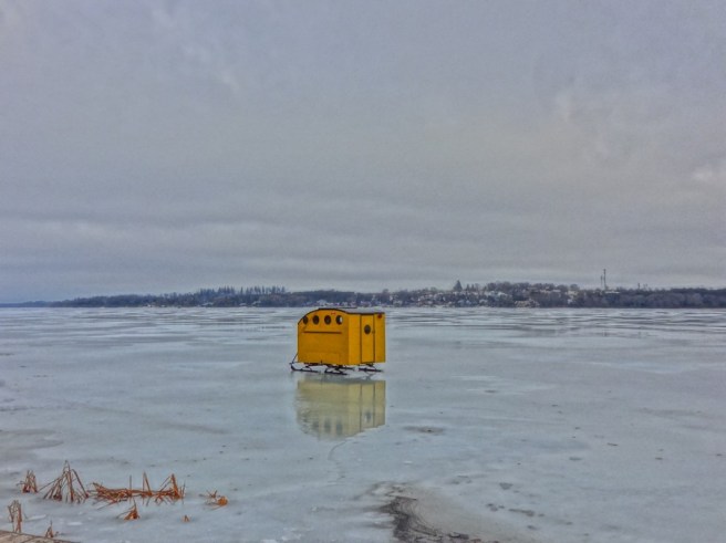 1. Oh perfect — first impression, “The Ladybug house goes for a spin on the ice.” But that’s silly of course — it is just so delightful, a little house on skates, reminds me of Baba Yaga, remember her? Definitely a fairytale feeling about this little mobile fellow, though I suspect it’s in fact a fishing hut? Or???? I love its brilliant golden orange and its reflection in the midst of this grey and icy scene.