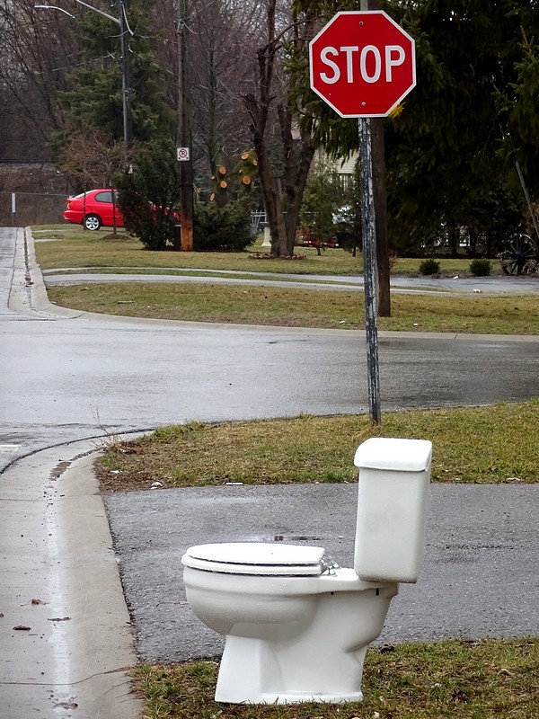 I recall very well. It was on the street where I now live. In fact, it might even have played a small factor in my decision to live in the Pointe despite its reputation as a poor, slummy, inner-city neighbourhood. Poor, yes, but not without pride, a sense of humour, an aesthetic. Of course now, almost twenty years later, the neighbourhood has become so gentrified that no one would leave a toilet on the sidewalk. (Unless their reno fellow left it for pickup the next day.)