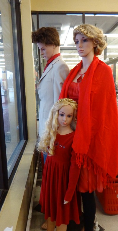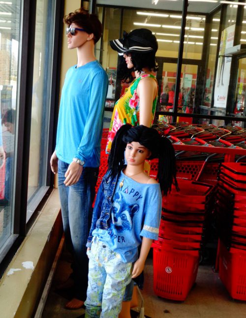 The wigs, the lack of affect, the brilliant orange… Creepy. Was this actually a display in a store?