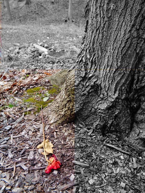 2. Happy for me Carin, because it looks like spring is slowly overtaking the scene, dead rose be damned. The rose is jarring – why is it there? Tossed aside by a jilted lover or simply abandoned in favour of finding a way to shimmy up that beautiful tree? Has the bearer of the rose emerged from the dark woods behind and seen better things ahead? – no need for a half-dead rose now!