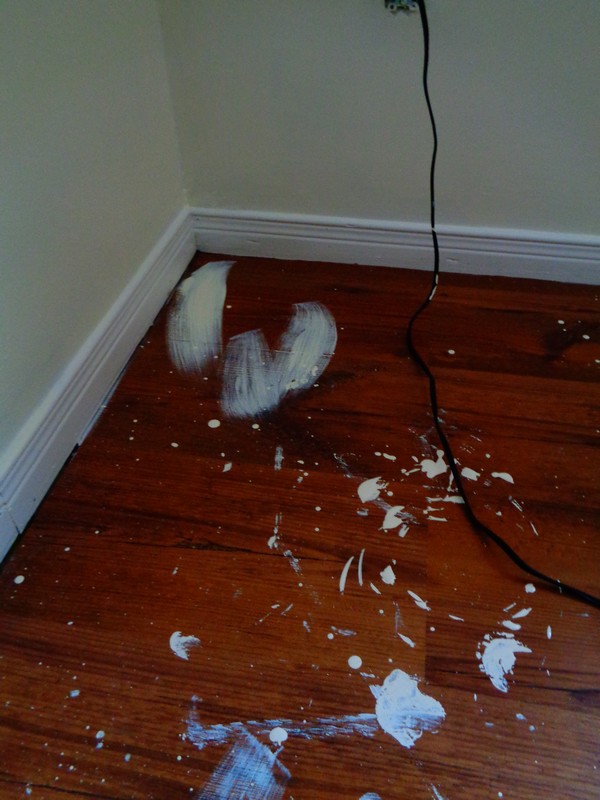 We had just finished our oak hardwood floors a few years back and my son dropped a litre of white paint onto the floor. Thank goodness we were able to clean it up quickly.