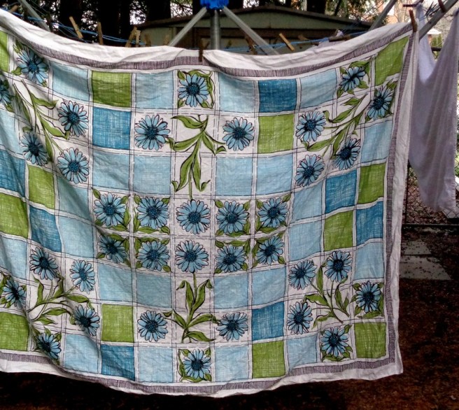 I love the 60’s look of this tablecloth. Bought at a second hand shop, so I suspect you’re right that it’s seen a few picnics… now lives occasionally on our kitchen table. I imagine it once upon a time gracing a formica and chrome table like my parents had. Big bouquet of daisies in the middle. Ah, spring!