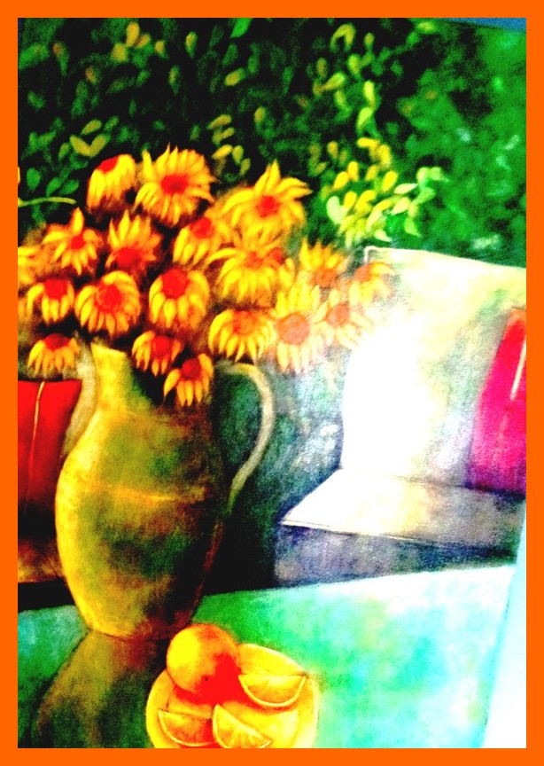 Teapot in excellent company… sunshine, pickle green walls and art by the amazing Toni Hamel — only a sliver of a piece called Star Charting — hard to see its beauty because of sunshine, but the effect of it makes me ridiculously happy for all it represents today on a personal note…)