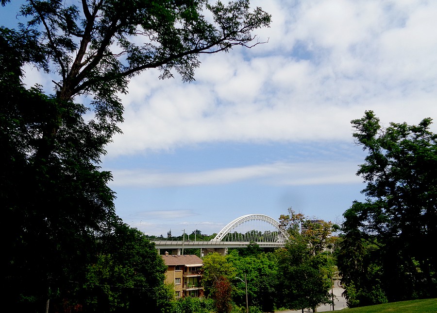Drive along Welland Canal as far as Thorold. Be surprised at how pretty the streets of Thorold are and how really extraordinary is this canal that connects Lake Ontario with the higher elevation of Lake Erie, a canal you grew up around, played Tom Sawyer on, but have never driven the entire length of (eight Locks) nor have ever seen the ‘steps’ of Locks 4, 5, and 6, which allow freighters to climb over the escarpment. Watch two freighters pass in opposite directions. One, coming into the Great Lakes from the St. Lawrence Seaway and/or Atlantic Ocean, and the other, ocean bound. Watch a couple of sailors embark on ocean bound one. Chat with young family from Woodstock who share your awe. Wilt a little in the heat.