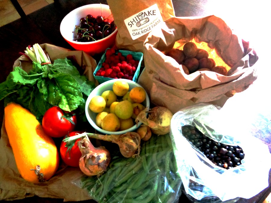 Postcard greetings of the market kind where a good time is being had by all. Not the least for having discovered the new shiitake vendor… AND scoring seed potatoes, ‘eating’ potatoes, BLACK CURRANTS!!, yellow plums, and a few more things in other and various hues.