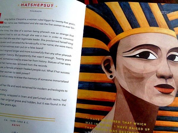 And how lovely to meet Astrid Lindgren (Pippi Longstocking), and Catherine the Great who did great things in Russia (including having her creepy husband Peter imprisoned, and Bolivian skirt-wearing mountaineers, Cleopatra (I didn’t know how powerful she was or that she was the last pharaoh to rule Egypt…. given how the focus on her, historically, has been her looks and that stupid asp; in fact her motto was “I will not be triumphed over.”). And then there’s Hatshepsut, another Egyptian pharoah. Huh, imagine.