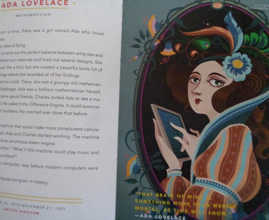 The first entry belongs to Ada Lovelace, a 19th century British mathematician whose bio begins, story-like….”Once upon a time, there was a girl named Ada who loved machines. She also loved the idea of flying. She studied birds to work out the perfect balance between wing size…” etc., and ends about 250 words later with this:  “Ada wrote the first computer program in history.”