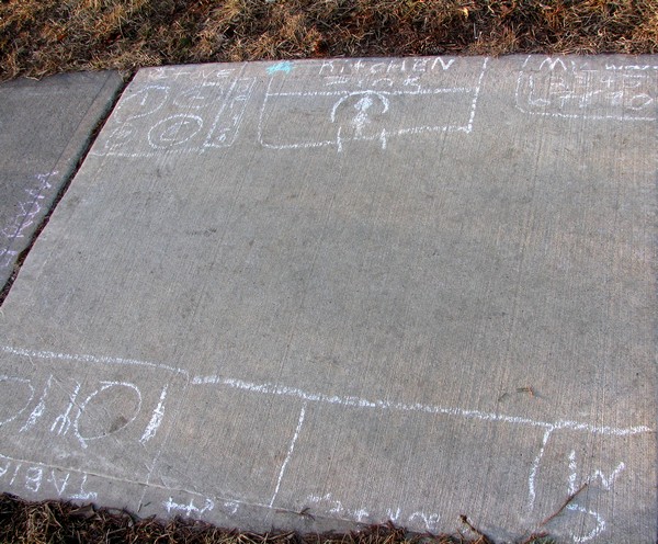 and the blueprints for a house interior sketched onto several squares of sidewalk.