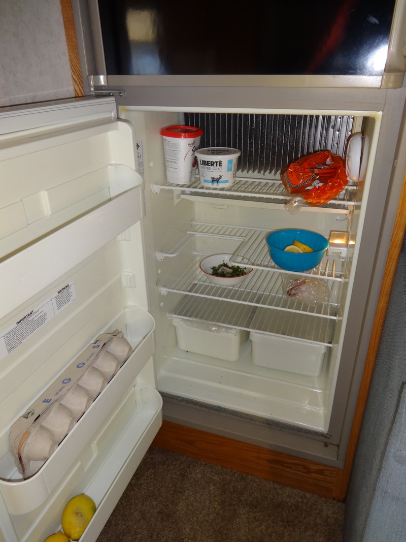 ↑↓ On our last morning, the fridge is almost bare. (This is both good and not good.)